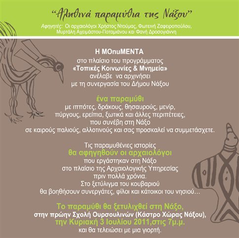 Την εκδήλωση διοργανώνει η MOnuMENTA στο πλαίσιο του προγράμματος «Τοπικές Κοινωνίες & Μνημεία» και με τη συνεργασία του Δήμου Νάξου και μικρών Κυκλάδων. Τις παραμυθένιες ιστορίες θα αφηγηθούν τέσσερις αρχαιολόγοι που εργάστηκαν στη Νάξο την περίοδο 1960-1995 στο πλαίσιο της Αρχαιολογικής Υπηρεσίας, αφήνοντας πολύ έντονα τα σημάδια της προσπάθειάς τους για έρευνα, προστασία και ανάδειξη του αρχαιολογικού πλούτου της Νάξου. Στο ξετύλιγμα του κουβαριού θα βοηθήσουν συνεργάτες, φίλοι και κάτοικοι του νησιού.