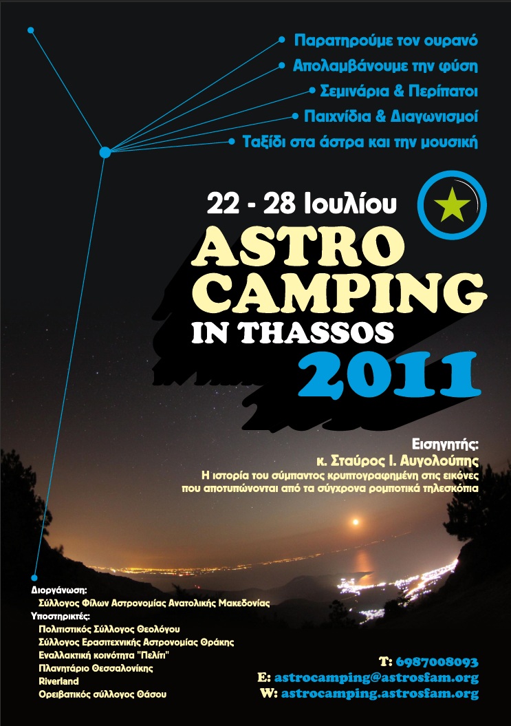 Το Astrocamping 2011 διοργανώνεται για τρίτη συνεχή χρονιά στα ορεινά της Θάσου. Με περισσότερες μέρες παραμονής (έξι) και πλήθος νέων εκδηλώσεων, η φετινή διοργάνωση θα δώσει την δυνατότητα για μαγικές εμπειρίες σε όλους εκείνους που αγαπούν τη γνώση, την φύση και τα αστρικά φαινόμενα.