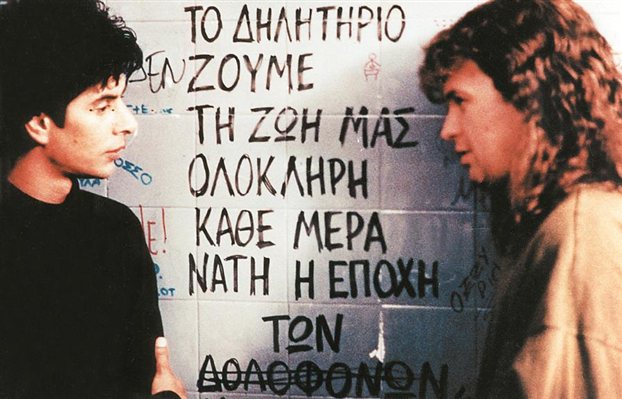 Σκηνή από την ταινία «Απόντες» (1996), σε σκηνοθεσία Νίκου Γραμματικού και σενάριο Νίκου Παναγιω τόπουλου, με θέμα την πορεία έξι φίλων από τα μαθητικά χρόνια ως τη στιγμή που ο καθένας τραβάει τον δρόμο του. Τα «Παιδιά του Κάιν» αποτελούν ένα είδος συνέχειας, καθώς οι παλιοί φίλοι ξανανταμώνουν πολλά χρόνια αργότερα