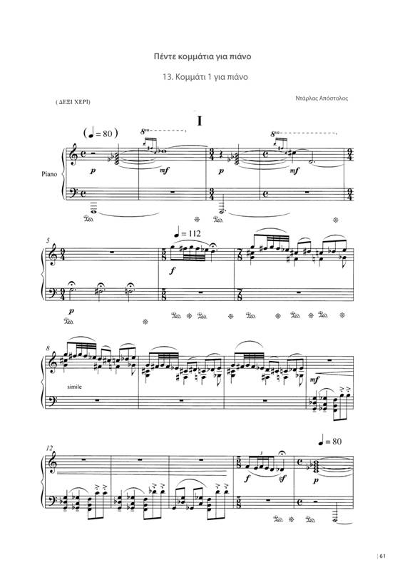 Απόστολος Ντάρλας: Προσωπικά γράφοντας έργα για πιάνο για ένα χέρι κι έχοντας πρωτογενείς ιδέες ως μουσικό υλικό, είχα τους εξής στόχους: α) ο εκτελεστής να εξερευνήσει όλη την έκταση του πιάνου, συνεπώς όλα τα δυνατά παραγόμενα ηχοχρώματα, β) την μουσική παρήχηση (κατά την γλωσσική παρήχηση), όπου ο ακροατής κατά την ακρόαση θεωρεί ότι το έργο εκτελείται με δυο χέρια. Αυτό επιτυγχάνεται με την ακροαματική ψευδαίσθηση παρατείνοντας με το sustain pedal φθόγγους σε χαμηλή περιοχή, ενώ το χέρι απομακρύνεται αμέσως σε άλλη περιοχή υψηλότερη, ή ακόμη εισάγοντας 2 φωνές, οι οποίες εκτελούνται με ένα χέρι. Επίσης, όσον αφορά το τεχνικό μέρος του πιάνου στο 5ο έργο , γίνεται χρήση sostenuto pedal –απομόνωση χορδών από τους επιλεχθέντες μονωτήρες- με σκοπό να δημιουργηθούν αρμονικοί ήχοι, οι οποίοι πολλαπλασιάζονται κατά τη διάρκεια της εκτέλεσης από τους φθόγγους που ακούγονται πραγματικά. Δημιουργείται η αίσθηση μιας «μεταποιημένης ηχούς», σαν την επιφάνεια της θάλασσας, η οποία κάποιες στιγμές λειτουργεί ως κύμα. Είναι κυρίως αυτές οι στιγμές κατά τις οποίες κοντινοί αρμονικοί ήχοι στην αρμονική στήλη, ενισχύονται λόγω της δόνησης σχετικών χορδών. Τέλος, επεδίωξα να προσδώσω και ένα επίπεδο δυσκολίας σε καθένα από τα κομμάτια, ώστε μέσω αυτού του κύκλου ο μαθητής να εξοικειώνεται με όλο και πιο δύσκολα τεχνικά και ερμηνευτικά ζητήματα.