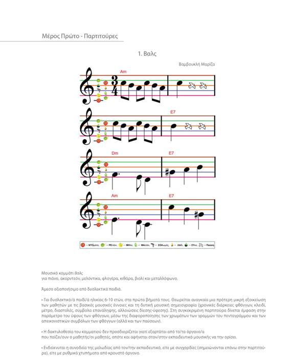 Για τα πρώτα η προσέγγιση έγινε εν είδει εξατομικευμένης διδασκαλίας (χωρίς αυτό να αποκλείει συνθέσεις προοριζόμενες για ομάδες δυσλεξικών παιδιών). Επιλέχτηκε ένα κομμάτι στον χορευτικό ρυθμό του βαλς (γενικότερα αγαπητός στα παιδιά) με διακριτή μελωδική γραμμή που αποτυπώνεται εύκολα στη μνήμη και που μπορεί να παιχτεί είτε από πολυφωνικά όργανα όπως το πιάνο, το ακορντεόν, η κιθάρα, είτε από μονοφωνικά όπως η φλογέρα και το βιολί. Δόθηκε επίσης έμφαση σε έναν ιδιαίτερο τύπο παρτιτούρας, δηλαδή γραπτής απεικόνισης, πράγμα που αποτελεί αδύνατο σημείο για ένα μεγάλο ποσοστό δυσλεκτικών παιδιών και που συχνά συνιστά λόγο συναισθηματικής τους απώθησης κατά τη διαδικασία εκμάθησης μουσικών οργάνων, όταν αυτή προχωρά στο στάδιο πέραν της προφορικής εκμάθησης «με το αυτί» και μέσω κιναισθητικής μνήμης. Η εν λόγω παρτιτούρα εστιάζει στην παράμετρο του ύψους των φθόγγων, μέσω της διαφοροποίησης των χρωμάτων των γραμμών του πενταγράμμου και των απεικονιστικών συμβόλων των φθόγγων και των παύσεων (που συμβολίζονται με πράγματα που τρώγονται, π.χ. ντο->ντομάτα, ρε->ρεπάνι κλπ.)